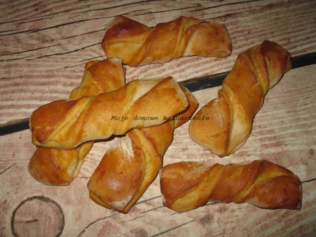 Przygotować rozczyn i odstawić go na około 15 minut w ciepłe miejsce.Mąkę przesiać przez sito, dodać pozostałe składniki i wyrośnięty rozczyn.Zagnieść ciasto, odstawić do wyrośnięcia.Ciasto rozwałkować w duży prostokąt i pośrodku posmarować nadzienie. Złożyć dwa razy ,pokroić na 3-4 cm pasy. Każdy przekręcić przez środek . Ułożyć na blaszce ,posmarować rozmąconym jajkiem z 1 łyżką mleka. Piec około 25 minut w temperaturze 180 stopni. Po wystudzeniu posypać cukrem pudrem lub polać lukrem.